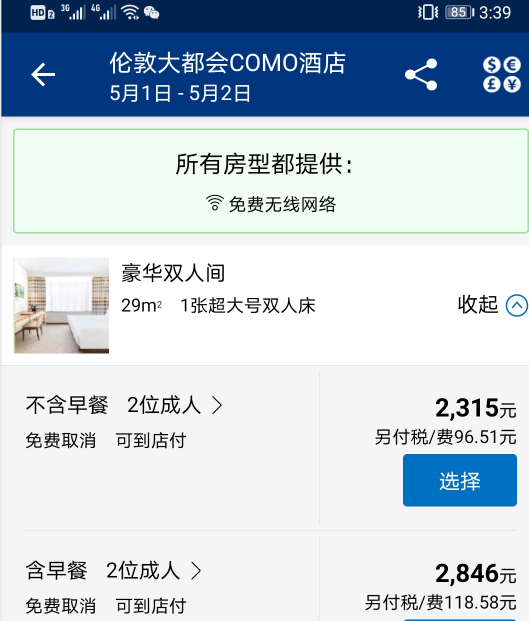 伦敦大都会COMO酒店预订价格 截图来源:携程APP
