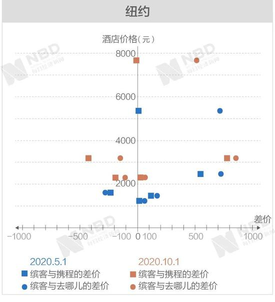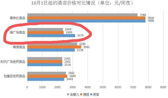 十一期间,位于美国纽约时代广场的瑞广场酒店,缤客的报价比携程和去哪儿网分别高出约765元和821元。