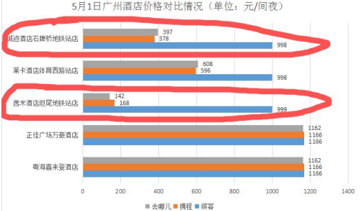 比如记者在对比五一期间广州酒店价格时发现,缤客平台上逸米酒店广州坦尾地铁站店大床房、莱卡酒店广州体育西路站店高级双床房、城迹酒店石牌桥地铁站店豪华大床房的价格分为999元、998元和998元。