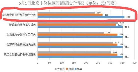 然而,在携程平台上,上述3家酒店同房型的价格分别为168元、596元和378元;去哪儿网上的情况相似,3家酒店同房型的价格分别为142元、608元和397元。