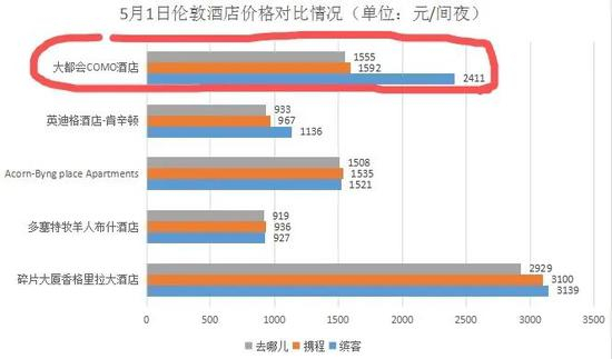 一家在携程和去哪儿两大平台上分别标价1592元(含税)和1555(含税)元人民币的伦敦高级酒店,在全球最大的在线旅游平台缤客(booking)上却标价2411元,比去哪儿多出约856元的花费!