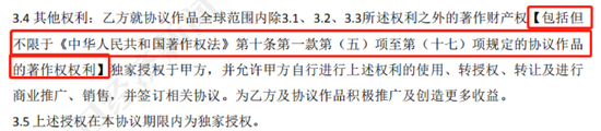 在新合同中,有关这一块的授权说明集中在3.1~3.9款,对比旧合同,新合同多了影漫游改编权、周边衍生品开发权和商品化权。“新增的几点是细则,但实际上,按照之前的旧合同,阅文已经把作者之后所有的著作财产权都拿走了。”王国华一针见血地指出。