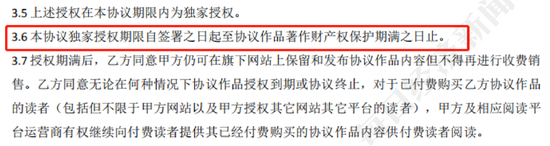 例如,“直到作者死后50年,版权都归阅文所有”,来自于新合同3.13款的“授权期限”,当中提到的“著作财产权保护期满之日止”即是饱受诟病的“死后50年”;而相同条款也出现在旧版合同第3.6款。