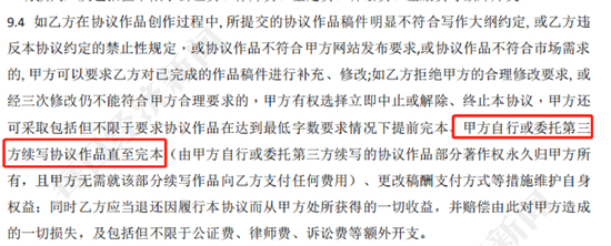 每经记者注意到,备受网文作家关注的“续写”内容,其实在新旧合同的9.4款中就出现了。“从法律的角度来讲是可以的。按照合同来看,实际上是作者对修改权的放弃或者对保护作品完整权利的放弃,所以平台方可以介入,通过‘合作’的形式保证作品的完整性。”王国华解释道。