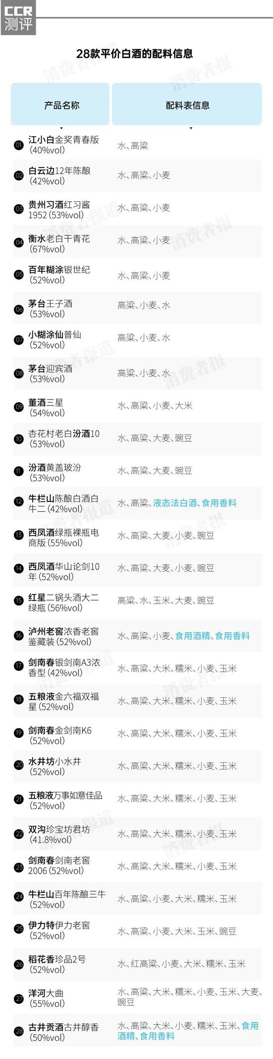 从产品标称的配料信息上看,此次参与口碑评价的28款白酒,其中25款为“纯粮酒”,余下3款采用固液法酿造而来,即俗称酒精勾兑的“新工艺白酒”。