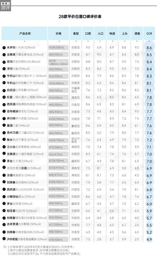 2020年4月,《消费者报道》汇总了京东、天猫、苏宁上热销的28款平价白酒(200元以下)的评价情况,对约6万条消费者评价数据进行分析及评分。