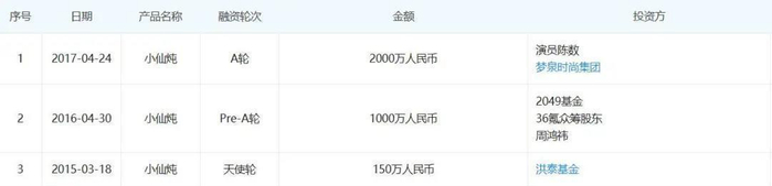 官网资料显示,小仙炖鲜炖燕窝品牌成立于2014年,由林小仙夫妇创办。2015年3月,获得洪泰基金领投的150万元天使轮投资。2016年5月,获得周鸿祎领投的1000万元PRE-A轮融资。2017年4月24日,小仙炖获得影视演员陈数领投的2000万A轮投资。