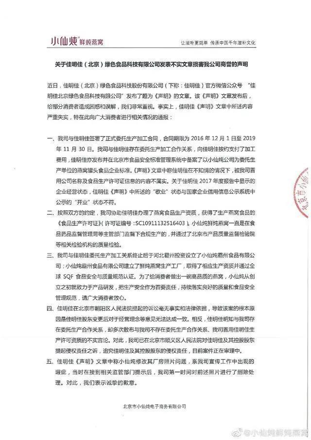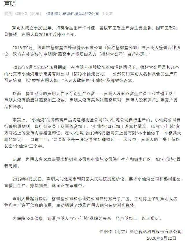 6月12日,佳明佳在官方微信发布声明,称在2016年9月至2019年6月期间,小仙炖曾长期使用佳明佳名称及食品生产许可证信息,以“委托佳明佳加工”名义销售“小仙炖”鲜炖燕窝。