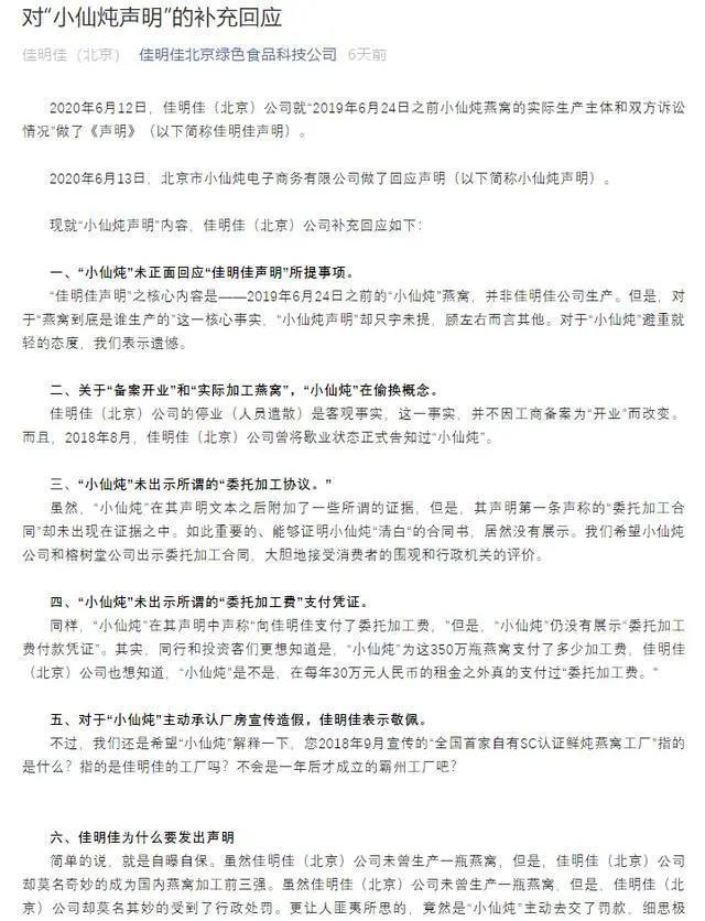 6月15日,佳明佳再次发出“对‘小仙炖声明’的补充回应”,称小仙炖并未正面回应佳明佳声明所提的事项:“燕窝到底是谁生产的”;“备案开业”与“实际加工燕窝”,是在偷换概念;小仙炖未出示所谓的“委托加工协议”,未出示“委托加工费支付凭证”。