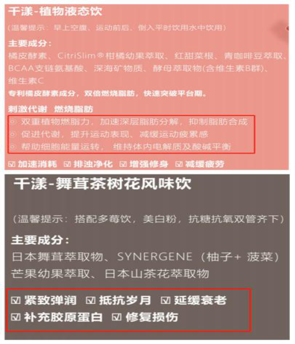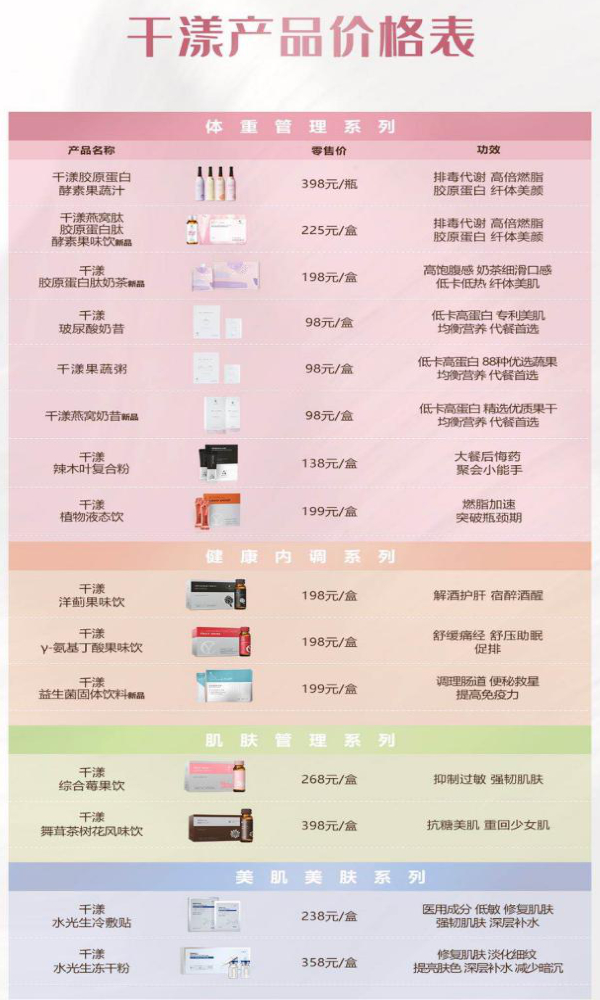 据上述知情人士提供的“千漾产品价格表”显示,千漾产品包括“千漾胶原蛋白酵素果蔬汁”、“千漾胶原蛋白肽奶茶”、“千漾益生菌固体饮料”等15款,零售价格在98元至398元间不等。上述15款产品都有对应的功效,其中,“千漾益生菌固体饮料”宣称能调理肠道、便秘救星、增强免疫力;“千漾综合莓果饮”宣称能抑制过敏、强韧肌肤;“千漾水光生冷敷贴”宣称含有医用成分,低敏、修复肌肤、深层补水等等。