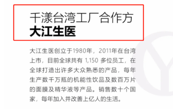 据微信公众号“千漾官微”2020年4月22日发布的“工厂与资质|CHANGE YOUNG千漾工厂介绍、全线产品官方资质”一文介绍,千漾的台湾工厂合作方为大江生医。