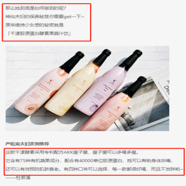 不仅如此,千漾生物在其官网多次发文称,多位明星为其产品打call,称“严屹宽夫妇亲测推荐这款千漾酵素采用专利配方AKK瘦子菌,瘦子菌可以多喝多瘦。它含有75种有机蔬果成分,配合有40000单位胶原蛋白,既可以帮助身体排毒,还可以有效预防肌肤衰老”。
