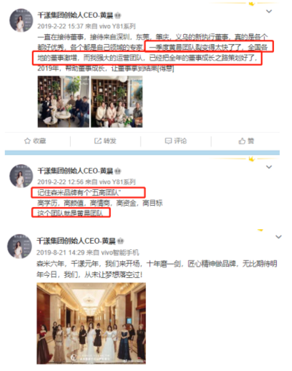 记者梳理发现,2018年至2019年期间,名为“千漾集团创始人CEO黄晨”的微博账号曾多次发文称,“黄晨团队属于森米品牌”、“做森米代理,很短时间内就能买房买车”。