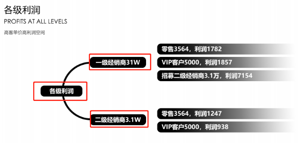 此外,记者从千漾代理分享的“千漾招商手册”获知,二级经销商(官方代理)零售零售3564元,可获利润1247元;一级经销商(执行董事)零售3564元,可获利润1782元,一级经销商(执行董事)招募一名二级经销商(官方代理),可获利润7154元。知情人士补充,千漾的联合创始人要做到1000万元的业绩(即拿货1000万元),要招募13个一级经销商(执行董事)来做这个业绩。