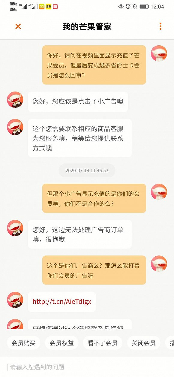 对此,记者分别联系了芒果TV以及爱奇艺的客服了解情况。芒果TV的客服表示趣多省是他们的一个广告商,有广告合作,但芒果TV客服无法处理广告商订单。随后给了记者一个链接,让记者通过该链接反馈问题。在打开该链接以后,发现其是一个第三方抽奖平台客服。在记者询问趣多省爵士卡的问题后,该客服给出的反馈是需要联系趣多省的官方平台才能予以解决。
