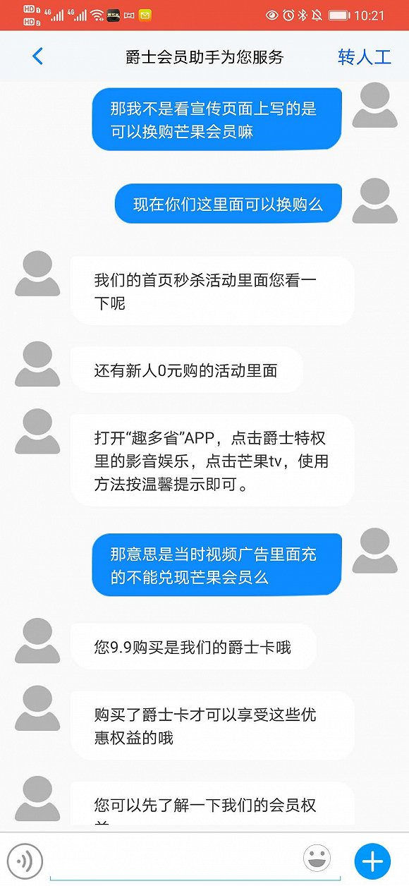 记者随后联系了趣多省APP的官方客服询问相关情况。但客服在回应时并未正面回答上述问题,而只是反复强调花9.9元购买的是他们的爵士卡会员。同时该客服还介绍,购买了爵士卡以后,就可以在趣多省APP官方首页秒杀活动以及新人0元购活动中购买相应的视频会员了。