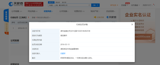 天眼查数据显示,汉堡王(中国)投资有限公司成立于2013年9月,注册资本约2亿美元。法定代表人为朱付强,其全资控股公司为汉堡王(香港)发展有限公司。天眼查风险信息显示,该公司名下全资子公司汉堡王(上海)餐饮有限公司在2016年3月曾因为食品案件被浦东新区市场监督管理局作出行政处罚。