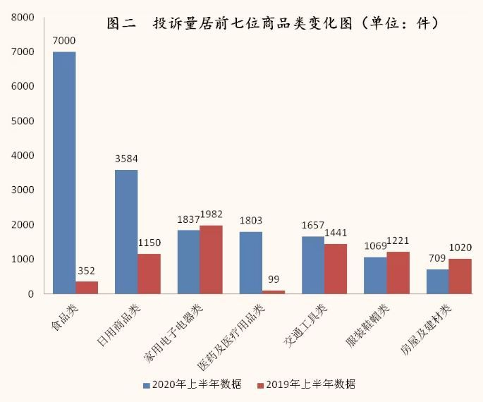 从商品类别投诉看,排名前七位的依次是:一是食品类,共计7000件,占投诉总量20.13%,同比增长1888.64%;二是日用商品类,共计3584件,占投诉量10.31%,同比增长211.65%;三是家用电子电器类,共计1837件,占投诉总量5.28%,同比下降7.32%;四是医药及医疗用品类,共计1803件,占投诉总量5.19%,同比增长1721.12%;五是交通工具类,共计1657件,占投诉总量4.77%,同比增长14.99%;六是服装鞋帽类,共计1069件,占投诉总量3.07%,同比下降12.45%;七是房屋及建材类709件,占投诉总量2.04%,同比下降30.49%件。