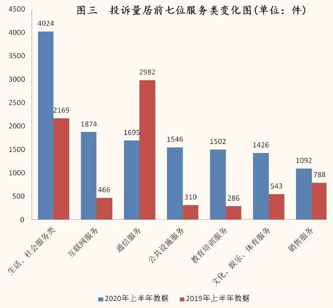 从服务类别投诉看,排名前七位的依次是:一是生活社会服务类,共计4024件,占投诉总量11.58%,同比增长85.52%;二是互联网服务类,共计1874件,占投诉总量5.39%,同比增长302.15%;三是通信服务1695件,占投诉总量4.88%,同比下降43.16%;四是公共设施服务类,共计1546件,占投诉总量4.45%,同比增长398.70%;五是教育培训服务类,共计1502件,占投诉总量4.32%,同比增长425.17%;六是文化娱乐体育服务类,共计1426件,占投诉总量4.10%,同比增长162.62%;七是销售服务类,共计1092件,占投诉总量3.14%,同比增长38.58%。