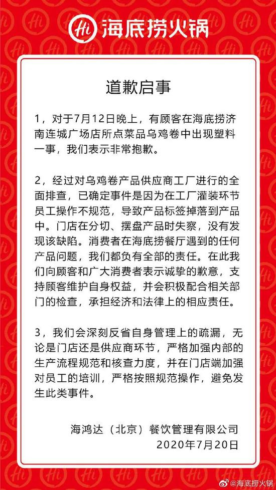 7月20日晚,@海底捞火锅发布微博称,对顾客消费时遇到的情况表示非常抱歉,有问题食品系供应商工厂灌装环节员工操作不规范,导致产品标签掉落到产品中。