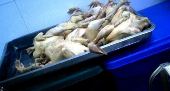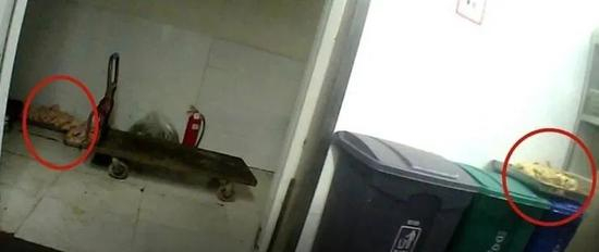 可以看到地面有污渍和杂物,生鸡旁边的板车也沾满了污渍。值得注意的是,连续两天都有煮熟的鸡肉放在垃圾桶上。