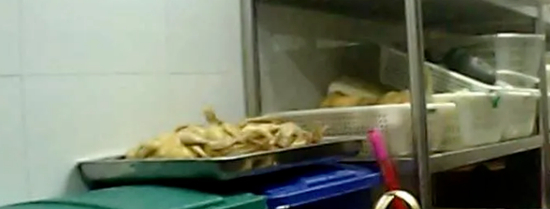但在绿茶餐厅该门店却看到这样一幕,煮熟的鸡用托盘盛放摆在垃圾桶盖上,另一边处理过的生鸡则放在厨房后门潮湿的地上。