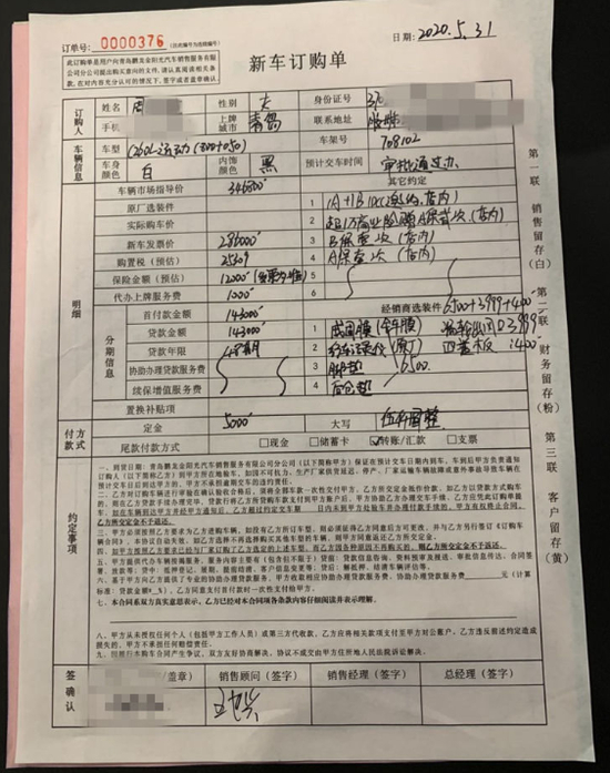 周女士说,6月11日交了车款首付并签订了合同,除了原车配置,她还加钱选装了音响、贴膜、镀晶、行车记录仪…