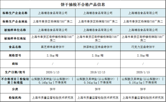 上海市市场监督管理局网站公示的不合格产品信息显示,3批次抽检不合格食品系上海靖浩食品有限公司生产的2.5kg/箱规格饼干产品,产品名称分别为黑芝麻味曲奇饼干、抹茶味红豆味曲奇饼干和巧克力豆曲奇饼干。3款产品中山梨酸及其钾盐(以山梨酸计)的检出值分别为0.140g/kg、0.341g/kg和0.191g/kg,标准值则为“不得使用”。