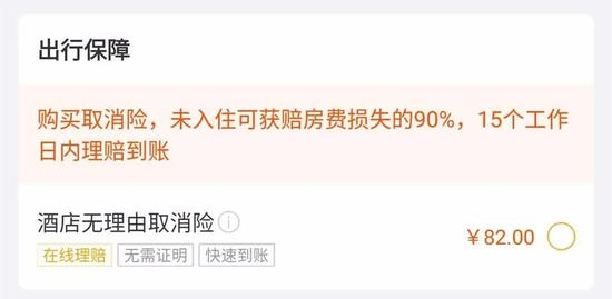 在飞猪平台,预订酒店页面下方有一个出行保障方案——酒店无理由取消险,险种下方注明“在线理赔、无须证明、快速到账”,上方则宣称“购买取消险,未入住可获赔房费损失的90%”。而取消险的后面则是一个小问号,点击后才会出现保险产品和条款介绍。