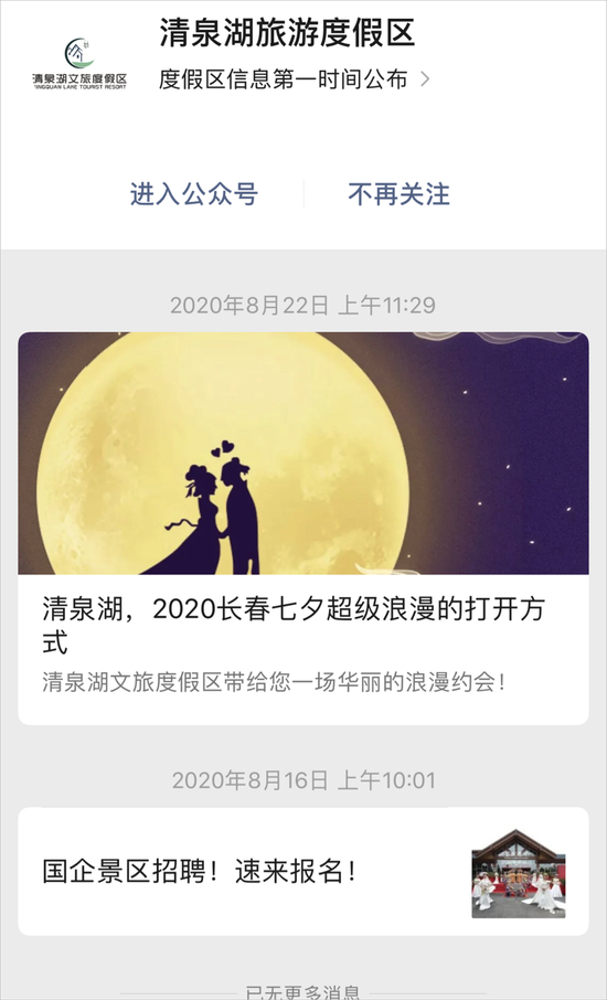 ▲清泉湖度假区微信公众号截图
