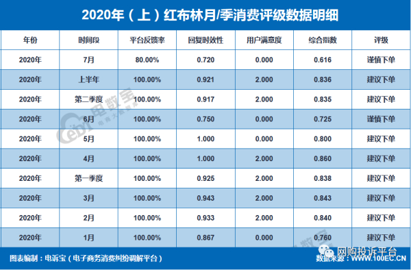 据“电诉宝”发布的《2020年(上)全国零售电商TOP30消费评级榜》显示,红布林的“用户满意度”评分仅为2分,而该项评分为10分满分制。同时,“电数宝”公布的数据显示,红布林在2020年6月、7月,连续两个月的消费评级均为“谨慎下单”,且“用户满意度”评分均为“0”。