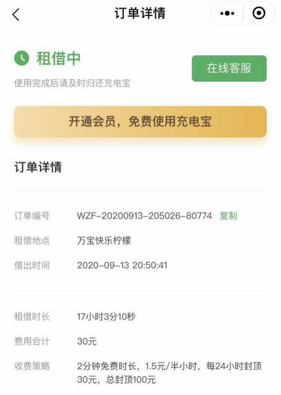 无独有偶,林先生也有类似的经历。他告诉《消费者报道》,9月13日他在一家饮品店租借了速绿充电宝,因店铺打烊,他租借了1小时20分钟左右就归还了。林先生回忆道,当时他按照正确的方式把充电宝插进充电仓,自己还特地按了几下充电宝,确认插入无误。然而随后林先生查询发现,计时仍在继续。他当下就通过速绿小程序联系客服,结果是机器人在回复,而联系人工客服则显示系统繁忙。无奈的他又尝试了几次,未果。第二天林先生的租赁时长达到了17小时,费用合计30元。