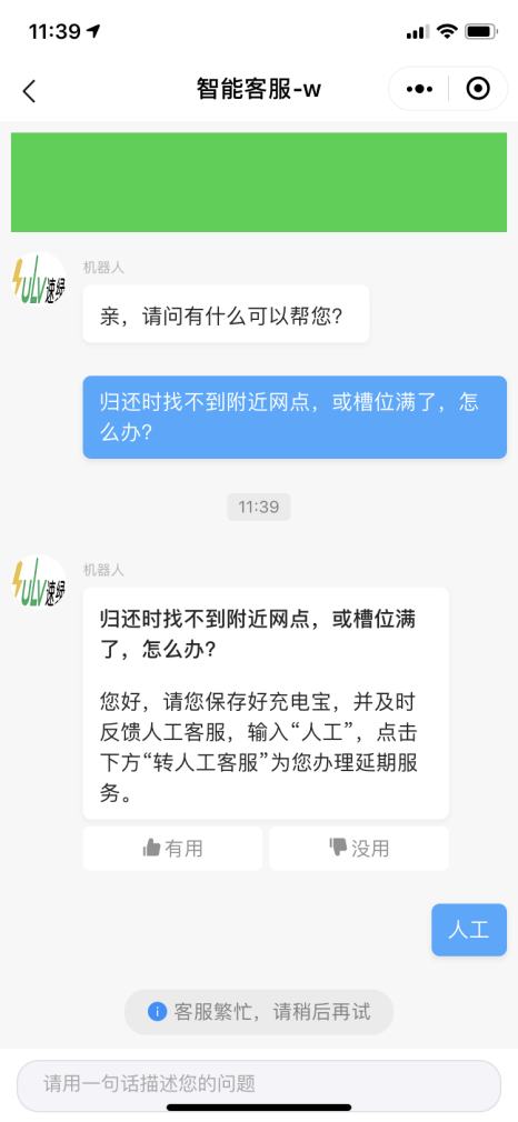 记者随机选择在某工作日上午11点半左右使用“速绿充电”小程序联系客服,先是由机器人回复,当记者点击转入人工服务时会显示“客服繁忙,请稍后再试”。