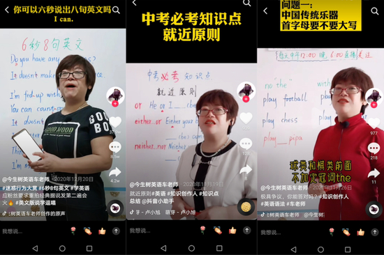 他们还会针对学生群体,中高考压力大、应试需求为主,更新做题方法、知识点等视频。视频大多以“据说80%初中生都不会”,“一次性学会英语的八种时态”等标题吸引人们注意,而这些内容大多是内容简单、低门槛内容。甚至有些老师的英文发音不标准,方法奇葩。