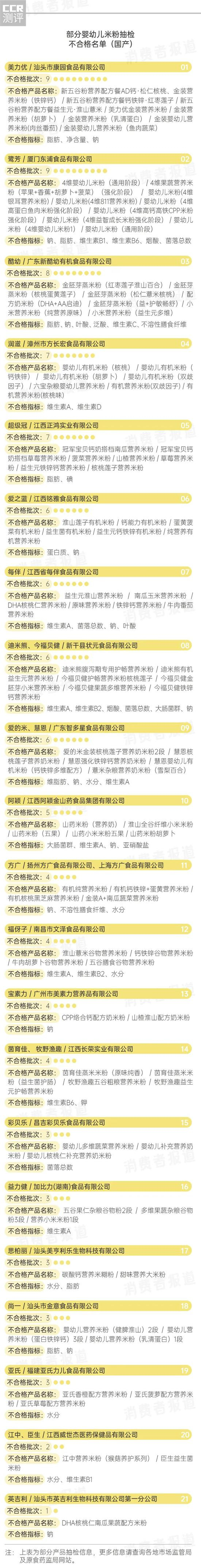 汕头市康园食品有限公司生产的“美力优”牌婴幼儿米粉,共有9批次产品不合格,不合格指标涉及脂肪、净含量、钠。
