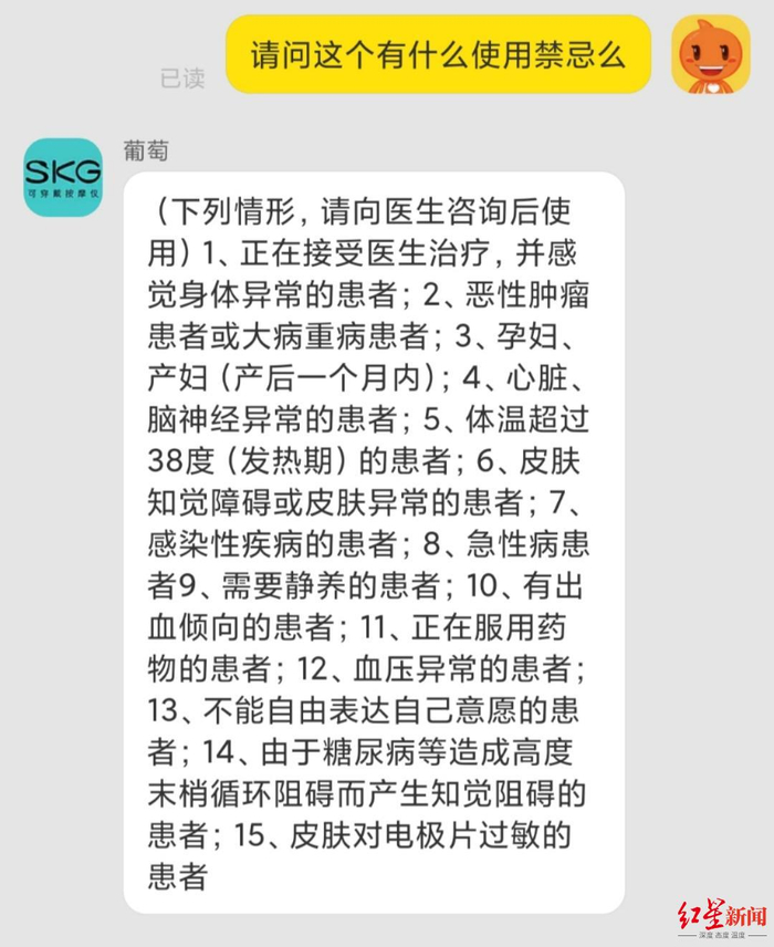 红星新闻记者登录天猫平台,发现李先生所购买的产品的链接显示已无法添加、购买,该款产品购买页面显示为月销量超过200个。该产品简介中列有五点温馨提示,包括勿让婴幼儿或心脏不良者使用该产品,但未提及高血压等疾病。记者以顾客身份在天猫上询问SKG旗舰店,客服表示,该款产品无法购买是因为没有货了。同时客服表示,SKG的颈椎按摩仪没有3C认证,暂不能提供产品说明书,购买后可获得。记者询问产品有什么使用禁忌,客服表示,一些情况需要向医生咨询后使用,并罗列了心脏、脑神经异常患者,血压异常患者等15种情况。“这部分使用禁忌在说明书中有体现。”