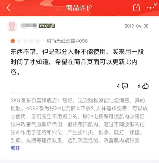 2020年7月9日,家住南京的李先生在天猫旗舰店花了599元购买了SKG原价799元的颈椎按摩仪。这款产品属于SKG的K5系列,型号为4998AI。据李先生介绍,因为其是上班族,而且自己部门一共6个人,有两个女生都买了SKG品牌的按摩仪,通过她们推荐,他也上网对比了一下各家产品,于是选择了这款仪器。