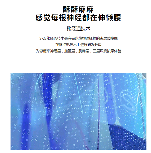 在SKG官网介绍其产品技术原理处显示,该公司产品采用“秘经通技术”,它是突破以往物理揉捏的表层式按摩,在脉冲电技术上进行研发升级,为用户带来神经层,血管层,肌肉层,三层深度按摩体验。在官网也提到了SKG采用的TENS与EMS脉冲,“在刺激颈部神经内啡肽的产生的同时刺激运动纤维,锻炼肌肉力量、增加血液循环,促进局部代谢,舒缓疼痛,环节局部肌肉疲劳。”