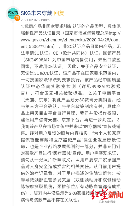 今年1月初,李先生开始和SKG联系,但是SKG认为,李先生病历显示既往史有高血压,而高血压患者在使用产品的时候应该注意。李先生告诉红星新闻记者,在晕倒送往医院救治前,他并不知道自己有高血压的情况。1月28日,李先生在黑猫投诉平台上投诉了SKG颈椎按摩仪。2月2日,“SKG未来穿戴”在黑猫投诉上进行了回复。其中分别对李先生提出的“产品无3C认证,是否是医疗器械”等进行了回复。上述回复显示,该公司产品非国家要求强制认定的产品类型,非3C认证产品目录内产品,无法申请3C认证。对于CE(欧洲共同体)认证,因该产品为中国市场销售使用,未出口欧盟国家,不适用CE认证。该产品经过中国质量认证中心华南实验室检测。回复中还表示,电商平台(天猫、京东)将此产品划分3C数码分类销售,产品上架类目由平台自行管理,与SKG无关。