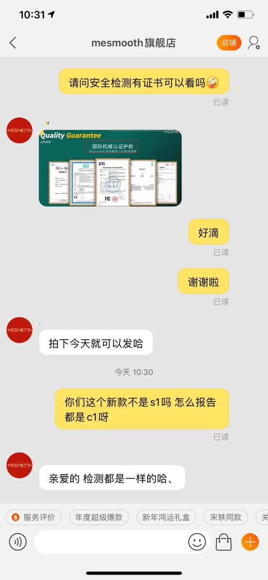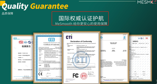 与此同时,智商税研究中心同Me-Smooth和TriPollar的客服分别取得了联系,Me-Smooth客服表示该产品温度在人体接受的范围内,均是经过安全检测的,不会烫伤,智商税研究中心又追问其产品合格检测证书时,客服发来了一张品质保障的宣传图片,放大后可以看见这五张证书检测的产品均是C1,与此次报道中的S1并非同款产品,向客服提出对产品报告的疑问时,其客服表示检测都是一样的。