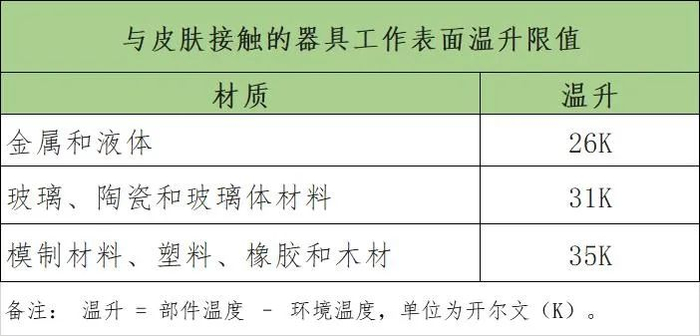 在对家用美容仪产品进行温升测试时,主要依据GB/T36419-2018《家用和类似用途皮肤美容器》标准附录A.4要求,与使用者或被护理人身体接触的器具工作表面的温升要求如下: