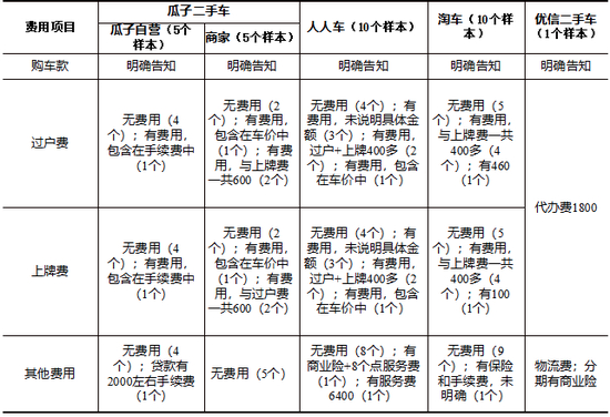 收费事项告知不清。部分平台存在未准确告知过户费、上牌费等收费项目的现象。各平台及商家存在收取GPS使用费情况,GPS 是金融贷款方为了降低商业风险安装设置的,若未征得消费者同意即将GPS 使用费转嫁给消费者,单方面加重了消费者的义务。