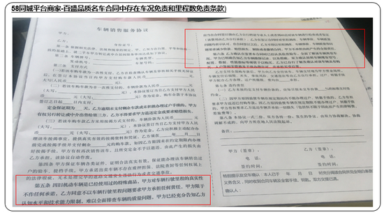 交易合同存在“霸王条款”。本次调查收集到商家合同10份、平台合同6份。从合同形式看,有买卖(销售)合同和居间服务合同,合同主体有三方(买方、卖方、居间方)和两方(买方、卖方)。从合同名称看,有二手车买卖居间服务合同、车辆销售合同、委托购车&交易保障服务合同等多种形式。主要存在两个方面问题:一是免除经营者责任,排除消费者权利。9份合同中有“里程不负责条款”,10份合同中有“车况免责条款”,显失公平,属于“霸王条款”。二是合同重要信息约定不明,易产生纠纷。