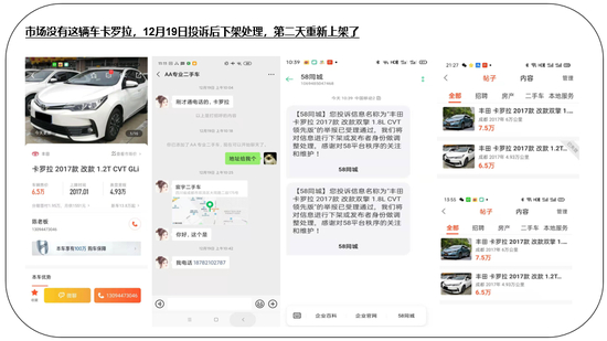 个别平台怠于审核把关。体验员对58同城展示车辆信息虚假现象进行投诉后,58同城先将该错误车辆信息下架,次日又将错误车辆信息重新上架。说明平台对车辆信息真实性的审核上把关不严,且在部分消费者投诉之后,仍未更改相应信息,显示了平台对消费者投诉问题未有效处理。