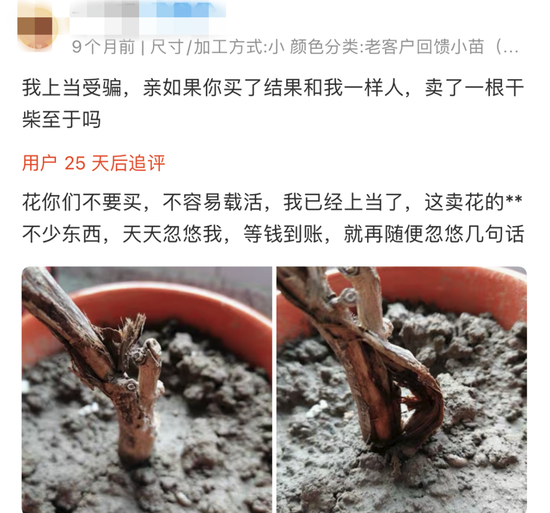 记者调查发现,这还是货到就能肉眼可见的,买家对商品的评价也实事求是。而对于一些生长周期比较长的品种,消费者往往只能自认倒霉。