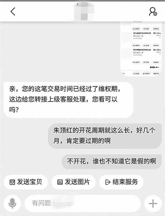 今年春节前,朱顶红终于抽出了花剑,又长出了骨朵。但张小姐却开始疑惑:“我买的几个种球都是不同的花色,可挂了骨朵的颜色都是一样的。”张小姐还是有点儿不死心,一直等到4棵朱顶红全都开放,才最终不得不承认上当了,4棵无一例外都是单瓣国产朱顶红。“再打开我的订单,发现产品已经下架。而且图片也都被删除了,无从对比。我多次联系客服,也没有人理我。申请售后,显示‘没有可发起的纠纷类型’。”张小姐说起来仍然很气愤,“最可气的是,当初我还给出了五星好评,现在也不能改了。”