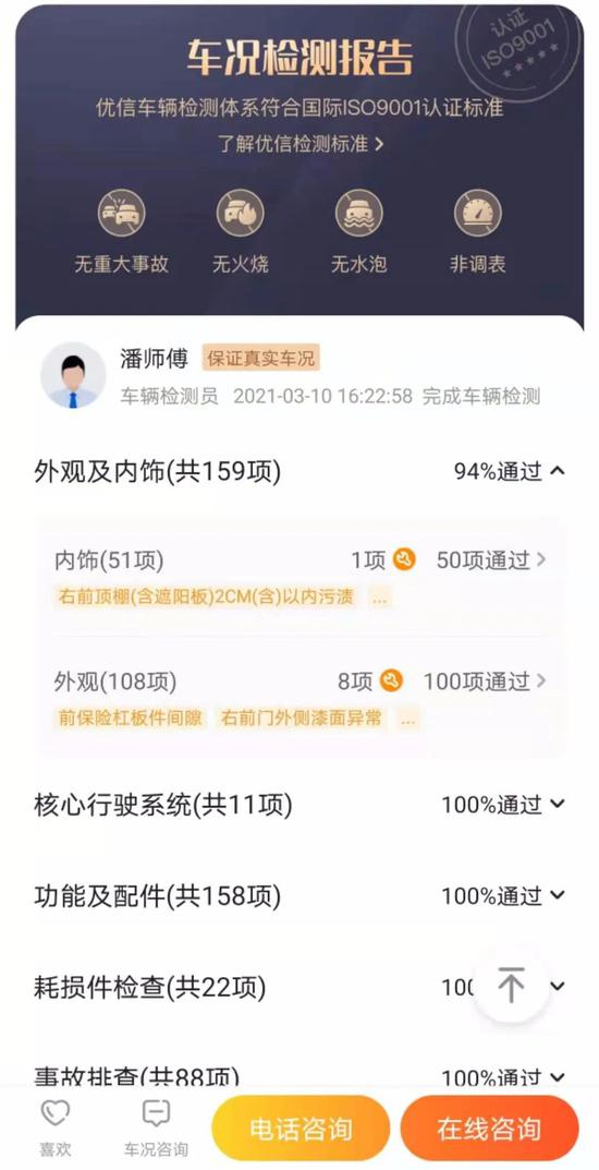 记者调查发现,优信提供的检测报告,说是检测报告,实际上就是优信二手车平台的页面,并无官方权威机构认证,记者以买车的名义联系上一名优信二手车的销售,要求查看车辆检测报告。