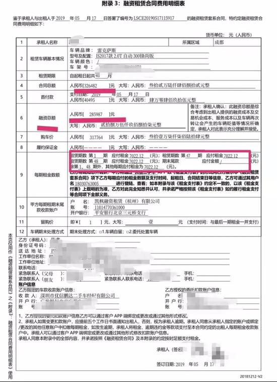 一份名为《融资租赁合同费用明细表》的文件内容显示,除去首付,陈先生融资总额为285987元,每月应付租金7022元,租赁期限为48期。也就是说,陈先生购入这辆二手车最终花费32万多元,比原先定价多出5万余元。