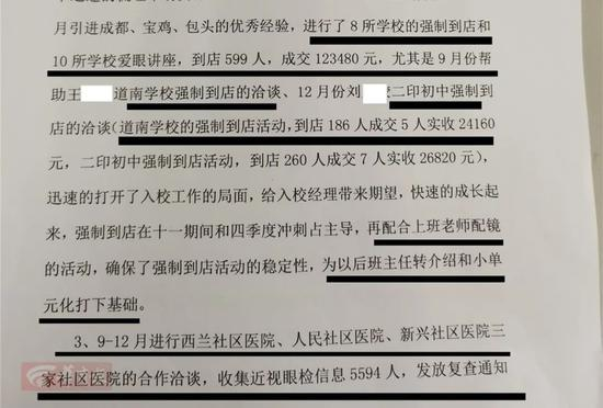 在这份《咸阳市场四季度冲刺总结》这样介绍:10月份开展6所学校活动和1所社区医院合作,分别为道南学校、陕科大强华、道北中学、风轮中学、师院附小、风轮小学、新兴医院合作眼检。其中,道南学校强制到店活动,到店115人成交1角2框(后经记者联系爆料人,爆料员工称,1角为销售一副“角膜塑形镜”)······