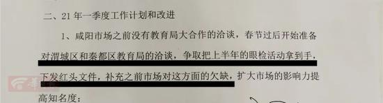 对于2021年一季度的工作计划和改进,《2020年述职报告》这样描述,将开展对渭城区和秦都区教育局的洽谈,争取把上半年的眼检活动拿到手,下发红头文件,补充之前市场对这方面的欠缺。